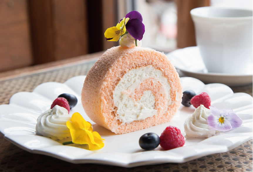 淡粉紅色的鬆軟蛋糕,搭配混合了北海道產白豆的鮮奶油,大幅降低了甜度,形成日本和西方融合的可愛甜點。