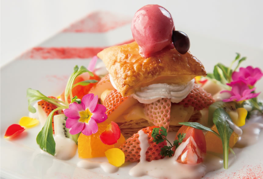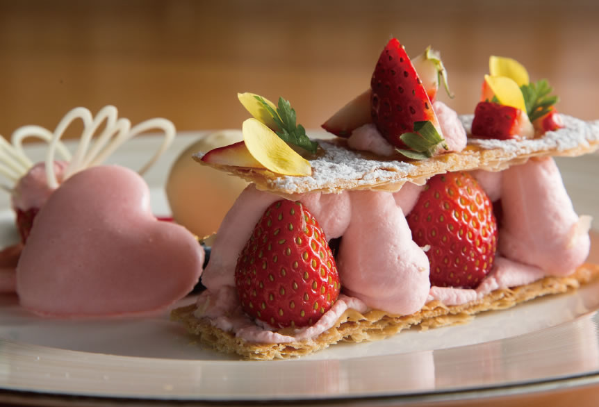 帶有春天印象的草莓千層派,旁邊以心型馬卡龍和蝴蝶巧克力點綴。內餡為清爽的莓果醬,適合細細品嘗味道在口腔中的變化,是絕佳的飯後甜點。