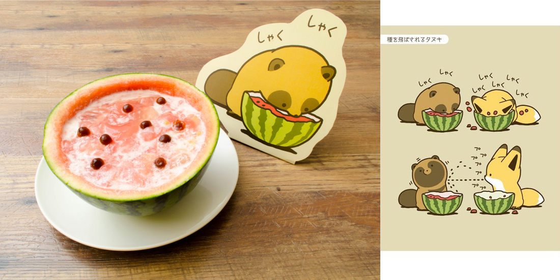 使用小玉西瓜做成的西瓜盅,裡面是西瓜汁跟果凍,小狸貓也吃的津津有味呢!(是說小狐狸真的很愛欺負小狸貓耶)