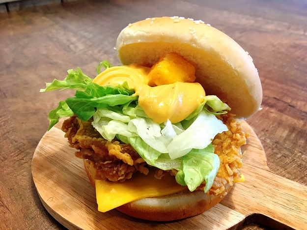 炸得金黃酥脆的咔啦雞腿肉,爆漿起司球、厚濃起司醬與濃郁起司片層層堆疊,記得享用前壓一下漢堡壓,讓酥脆綿密的起司乳酪球在漢堡中爆開,讓濃郁的起司滿溢,自己看了也滿意啊!(笑)