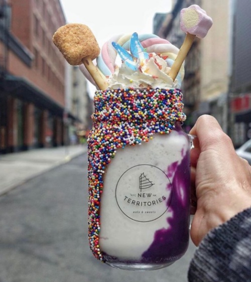 紐約客現在最瘋的飲料就屬這款New Territories NY的招牌–獨角獸奶昔,以冰凍優格、牛奶和草莓冰淇淋為基底,撒上巧克力糖粒,最後插上夢幻的棉花糖彩虹橋就完成啦~