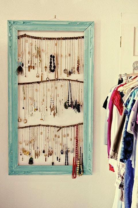 只要一個畫框再加上幾根樹枝,就能變成專屬於你個人的飾品牆。一般的畫框通常都是黑色或深色,你可以利用噴漆或是油漆上色,接著再釘上樹枝,並在樹枝上裝上S型或是C字型的小鉤子,記得間距盡量一致,否則掛上去的項鍊也很容易打結喔。