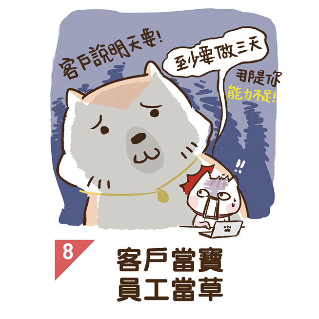 公司對外溝通時,應該是站在員工的立場爭取合理的工作量及準備時間,若總是為了迎合客戶而過分要求自己員工,這樣的老闆真的不跟也罷啊!可惜這種現象在台灣的職場其實蠻普遍的,底層員工的權益似乎總是習慣性地被犧牲....(淚)
