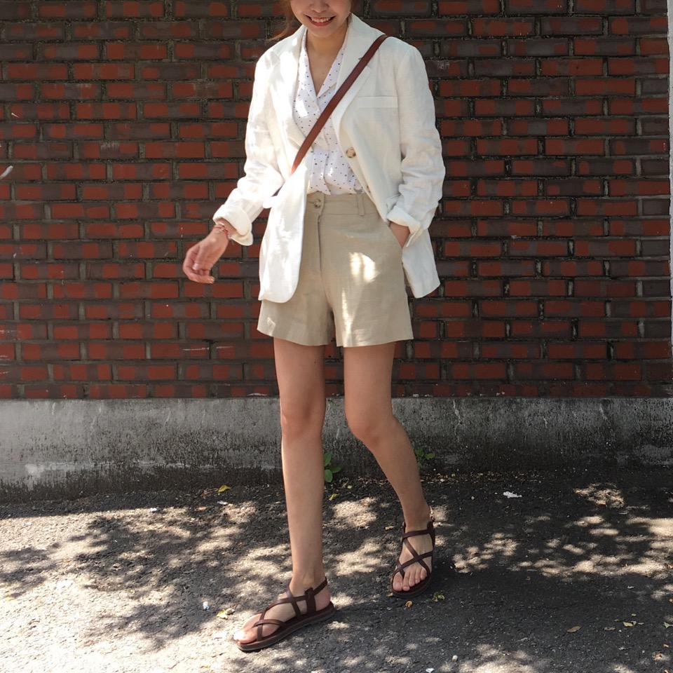 下身搭配駝色棉麻西裝短褲,褲管無反折的俐落設計又多了一點成熟的氣息。
