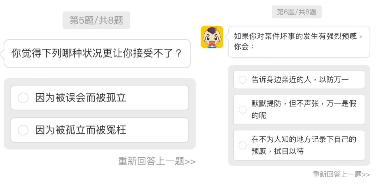 再來則是測出你最真實的一面,對於已發生的事你會如何應對?假如馬戲團裡傳出有隻動物變異逃脫,你覺得會是哪一種動物?對於被誤會這件事,妞編輯寧願被孤立,也不想被冤枉而感到委屈,妞妞們覺得呢?