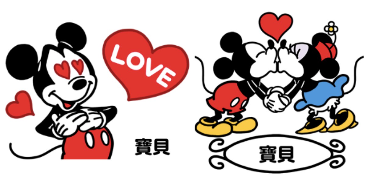 想用貼圖跟另一半示愛?就把內容改成「寶貝」或「愛你」等甜蜜的文字吧♡米奇米妮相牽著手親親那張貼圖,實在是太閃了啦~非常建議跟另一半一人買一組,然後你們就可以在聊天室裡面用這組貼圖瘋狂秀恩愛!(而且還完全不用打字哦)