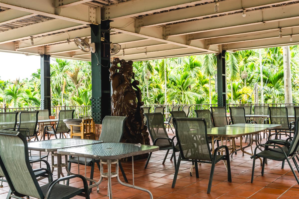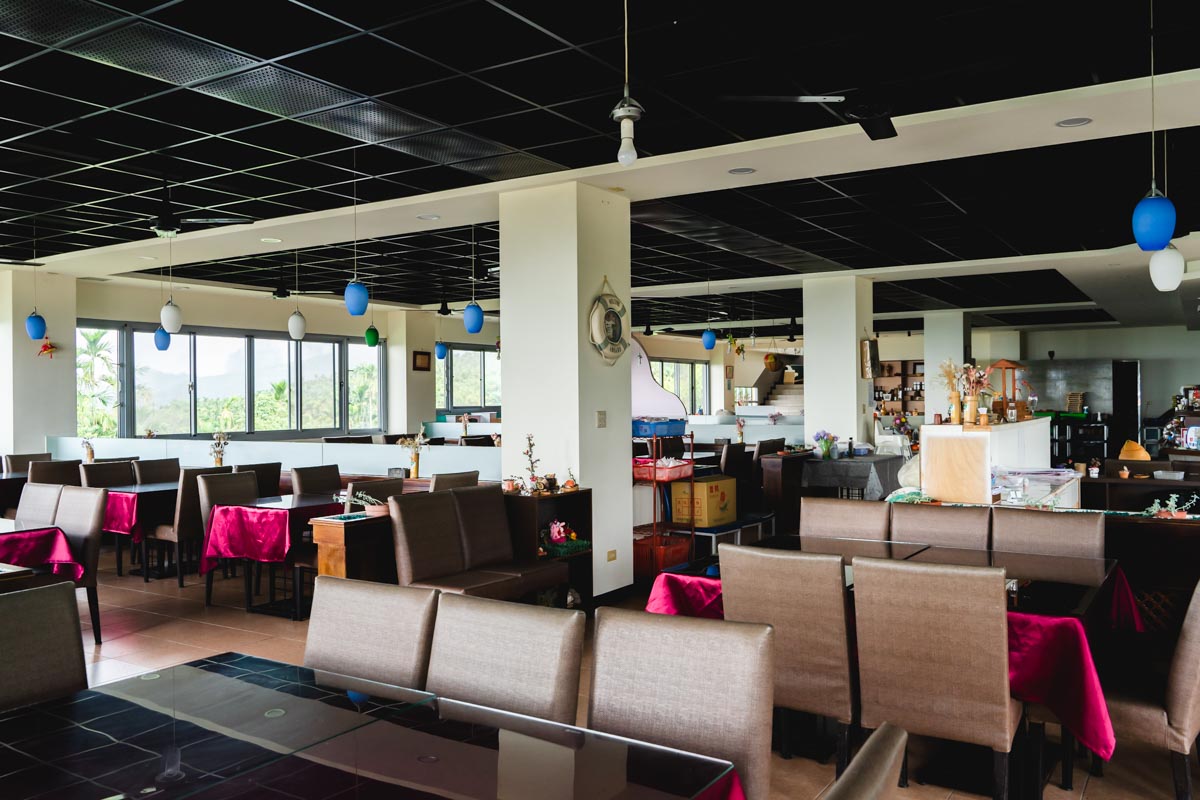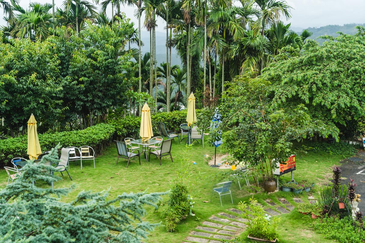 「阿比加咖啡」有著三層樓高,整間風格既有點古早味又有點原民混搭風,儘管店家環境沒有冷氣但假日依然有不少家庭、情侶回訪。這裡不僅擁有綠蔭環繞,二樓還有一片綠葉紅花相互映襯的戶外庭園,其中三樓的視野是最遼闊的,少了玻璃窗框架的半開放式的空間,讓遠眺的視野更加無拘無束。