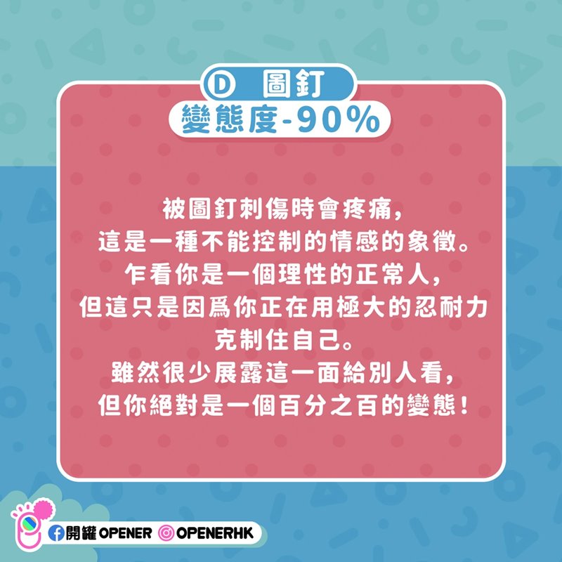 被圖釘刺傷時會疼痛,這是一種不能控制的情感的象徵。乍看你是一個理性的正常人,但這只是因爲你正在用極大的忍耐力克制住自己。雖然很少展露這一面給別人看,但你絕對是一個百分之百的變態!
