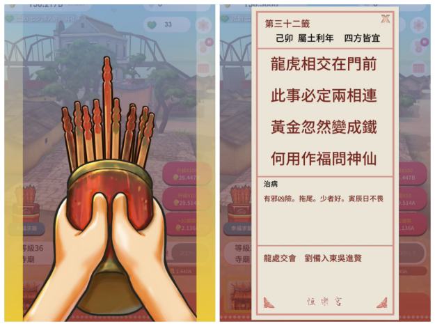 最特別的是,在經營城市之餘,還可以到廟宇裡求籤!點選所求類型之後,畫面就會跳出雙手正在洗籤的模樣,然後系統就會替你抽出一支木籤,並秀出對應的籤詩。