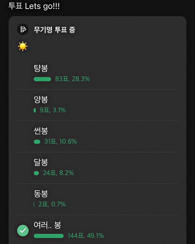 原來在6個投票選項中,除了以太陽韓文「태양的縮語」取名的턍봉脫穎而出,另一個居然是選項最底下的「還有各種…手燈(여러봉)」,明明通常都是湊數(?)用或是一般問卷的選項,居然投票人數多暫居第一位,讓本尊也發文喊話了!