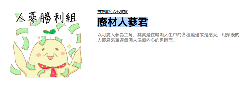 是der,你的痛苦人蔘都知道,今天就讓《廢材人蔘君》說出你的心聲,一起互相討拍,跌倒了就用力嘲笑對方,笑著笑著眼淚就流下來惹...(咦?!)就跟著手機小姐一起來看看,關於這支人蔘,有點厭世、有點廢,但又有點勵志的故事...