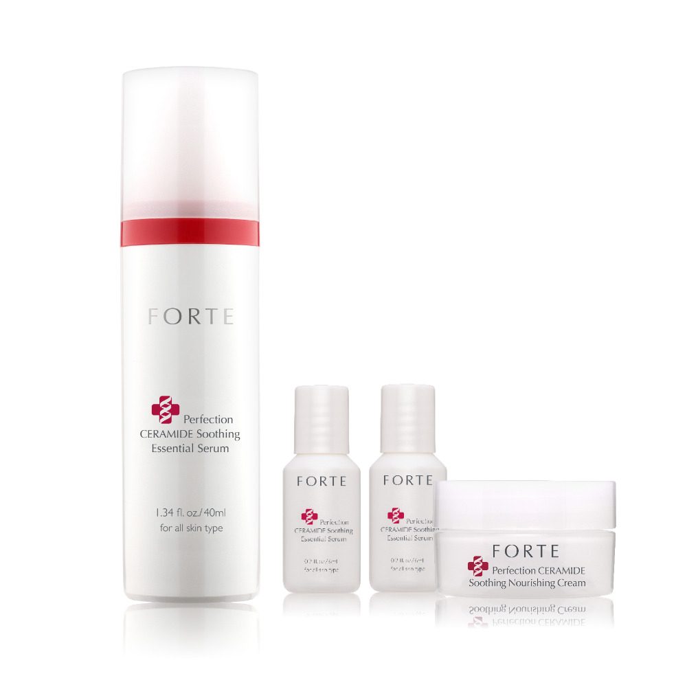 FORTE新一代「Ceramide全效舒緩精華液、Ceramide全效舒緩滋養霜」以更親膚、吸收力更佳的專利醣基神經醯胺搭配多重修護因子:甘草次酸、蛇床子、積雪草苷、有機復活草、維他命B5與小花蔓澤蘭萃取,進化升級肌膚的保濕補水力、舒緩修護力與屏障防禦力,完美實現肌膚自由、KO肌敏!歡慶「Ceramide全效舒緩系列」全新上市,推出週年慶限定優惠組合【全效舒緩組】、【舒緩滋養組】,邀請渴望健康穩定膚況的你即刻入手,重拾自信神采!