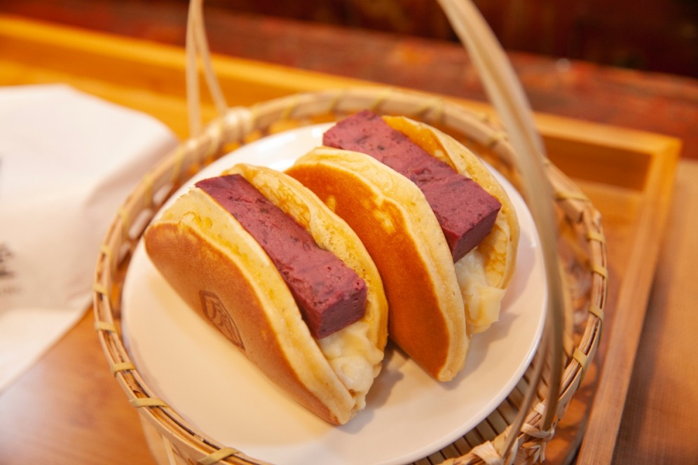 店裡招牌「虎尾燒」是網路人氣打卡商品,新鮮現煎的麵皮配上香濃紅豆餡,最後再放上一小塊的憨吉濃濃乳酪蛋糕,將古早味銅鑼燒與地瓜結合相當有創意,真材實料&精緻小巧的外型擄獲不少少女前來拍照!(新口味紫薯是假日限定喔)