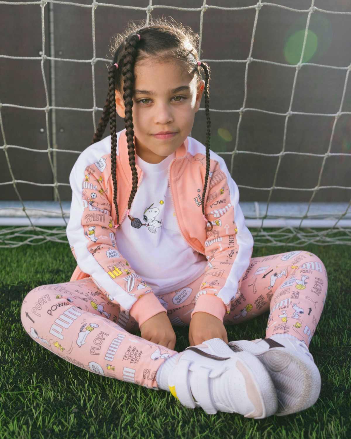 除了大人的服飾與鞋款之外,這次與史努比聯名的系列也有推出童裝款式,其中粉橘色的印花套裝印有滿版的史努比與PUMA品牌標誌,剛好跟上現在正流行的復古運動套裝熱潮。這次的聯名系列將會在1月15日正式上市,喜歡史努比的妞妞們過年就穿上這次的聯名新裝吧!