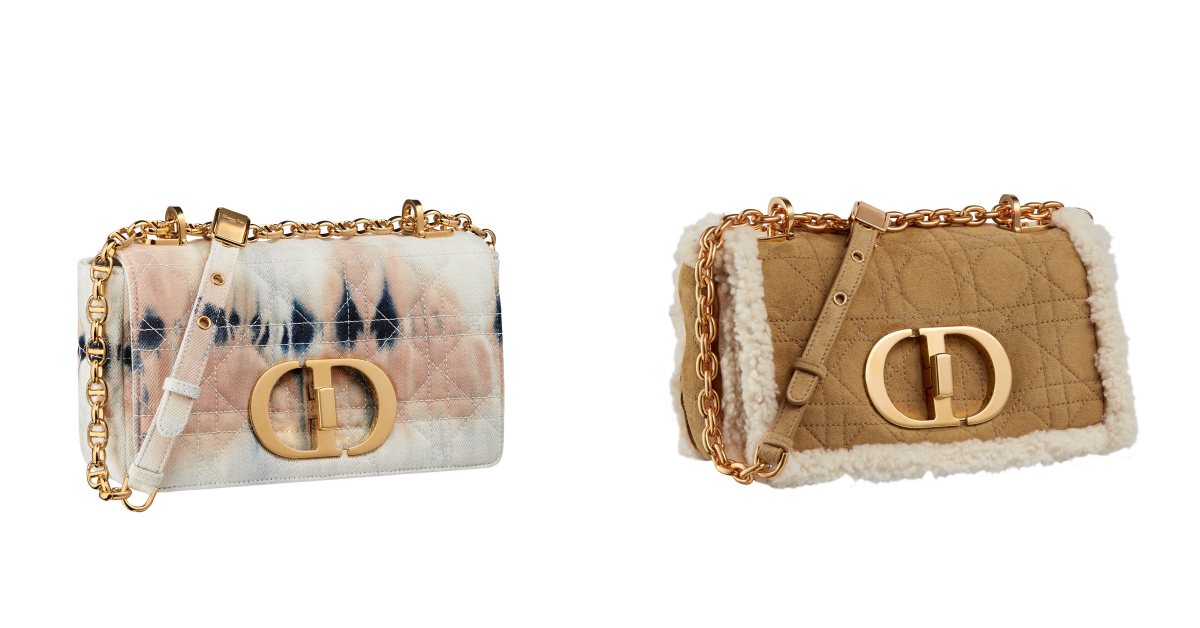 Dior Caro 拿鐵白籐格紋柔軟小牛皮大型翻蓋包 NT.140,000、丹寧籐格紋刺繡小型翻蓋包 NT.110,000、多彩紮染丹寧籐格紋刺繡小型翻蓋包 NT .115,000、駝色翻羊毛小型翻蓋包 NT.140,000