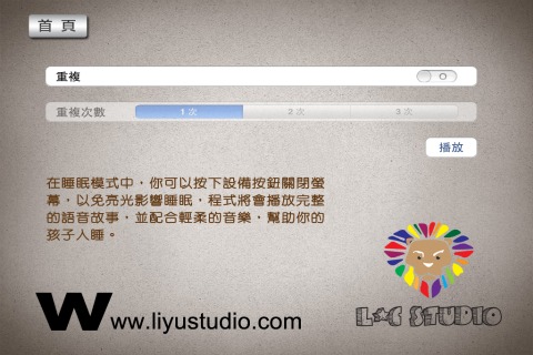 在首頁右上角的選項為睡眠模式,此功能可以關閉螢幕的情況下聆聽故事,讓小孩子在聽故事的過程中慢慢進入夢鄉而免為螢幕的亮光所干擾,這樣的設計可是在眾多電子故事書中較少見的,相當的貼心