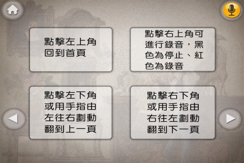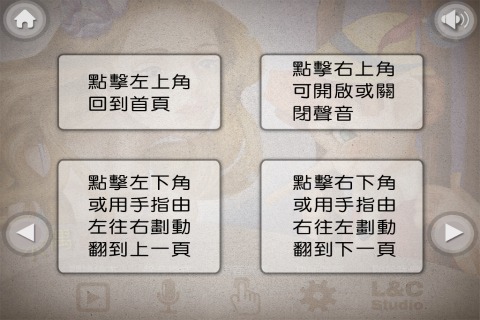 按下[閱讀繪本]後開始閱讀故事,一開始會先介紹操作說明,按下左上角的房子圖案可以回到首頁;右上角的喇叭圖案可以開啟/關閉聲音導讀,由於是國人自製開發的電子故事書,因此優點是口音相當道地而沒有所謂的大陸腔,若是大人親自陪著小孩讀故事書,可以透過關閉導讀而親自念給小朋友聽。