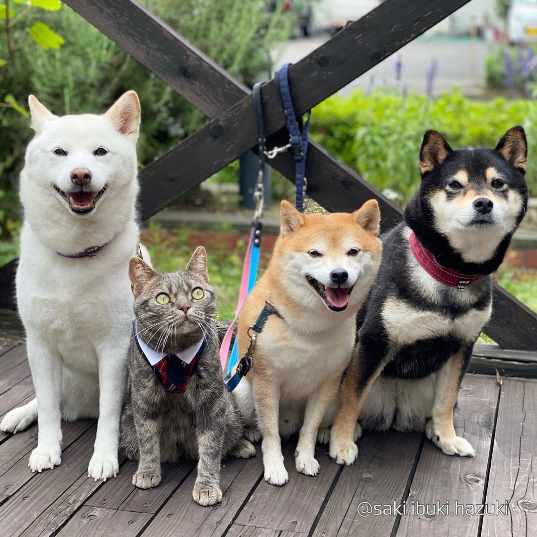 這位日本飼主經常在社群平台分享家中萌孩子的生活,四隻小朋友分別是白柴大姊Saki黑柴二姊Ibuki豆柴弟弟Hazuki貓小弟Kiki。而Kiki小時候就跟柴柴們一同長大,不僅不會護食(不讓其他人吃飯),更不會吵架、互相爭寵,總是喜歡窩在一起睡覺,連業配文都一起代言,感情好到沒話說!