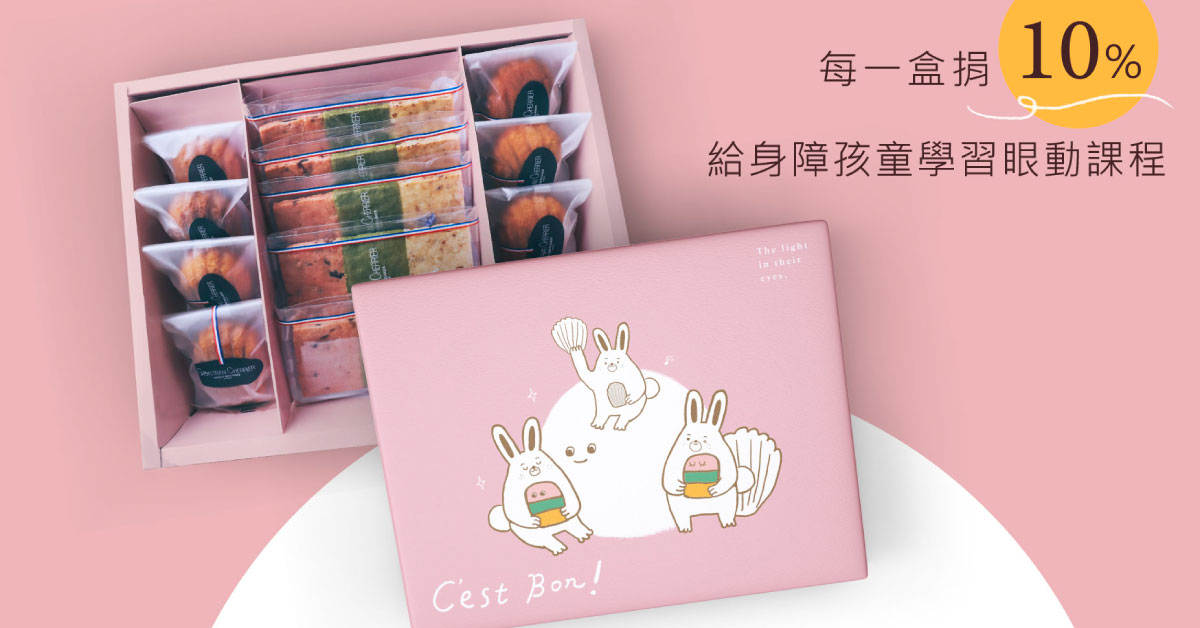 8/31前訂購,享早鳥價$800元!每一盒捐10%給身障孩童學習眼動課程,今年中秋,邀你享用濃濃法式風情的鳳梨瑪德蓮與目目餅乾,將善意回饋給需要的人們。