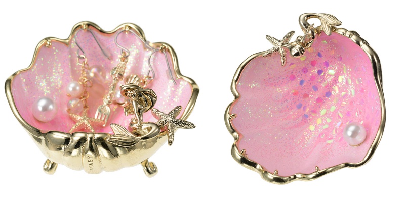 這款珠寶托盤整個超浮誇~外層漆成金色,還有一隻金光閃閃的小美人魚坐在上面,貝殼裡面佈滿了粉紅色亮片,還有洞洞可以讓你勾著耳環,本身也附了3只不同造型的耳環喔!