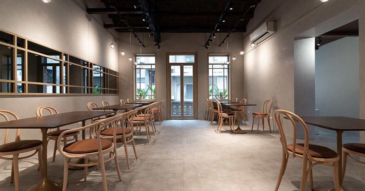 設計上,呼應 Moshi 一貫的簡潔美學,整體空間運用俐落的莫蘭迪灰色調為主,搭配具有café chair 別名的 No.14,18, 以及現代主義大師柯比意愛用的No.30 椅子,與 Moshi 風格契合的 SEEDDESIGN 喜的燈飾設計作品點綴天際線,勾勒出優雅柔和的視覺效果。設計元素同時也保留了老宅外觀原本的紅磚牆,俐落地嵌入現代簡約的內在,搭配低飽和度的朦朧灰色,運用細膩的玫瑰金燈飾線條、溫暖的木色桌椅點綴,配合大片視覺穿透的光影照射,在隱隱散發的知性氛圍中,注入自然光線,在空間中可見拱門的元素穿梭其中,呼應羅馬時代人類突破舊有建築的限制,開啟文明新的一頁,在創新中與大自然取得平衡!