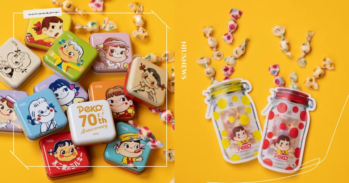 牛奶糖小方罐印上1960年製2010年的peko醬,還有70週年限定版,共有12款圖案,每盒內隨附3個經典牛奶糖,吃完糖果後盒子可用來收藏個人小物,或作為收藏品展示。