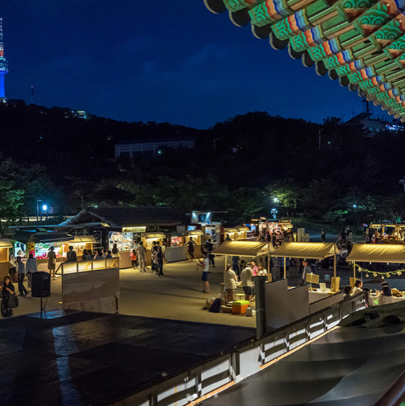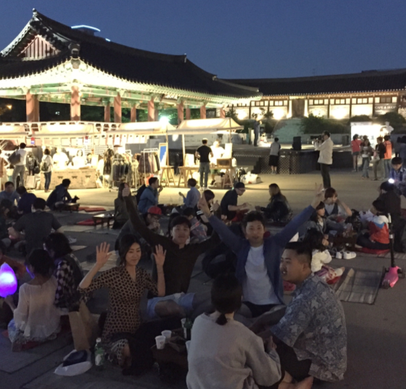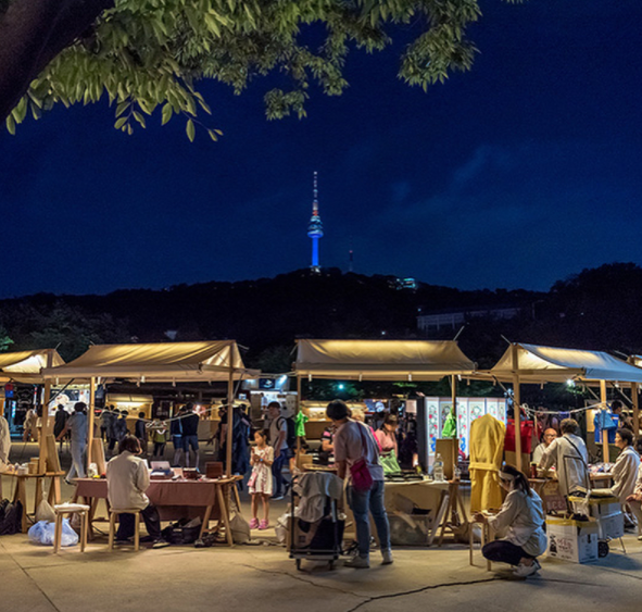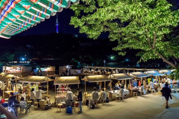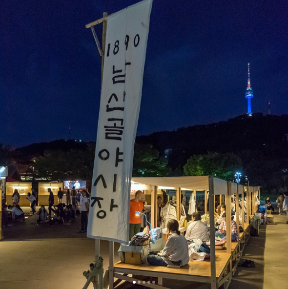 1890南山谷夜市沒有一般夜市的擁擠和吵鬧,場地很寬敞,大家都帶著野餐墊席地而坐,賞月、遠眺首爾塔,很有悠閒的氛圍。南山谷夜市很適合和好友一起野餐小酌,拋開現代生活的煩悶,享受古時候的慢步調。
