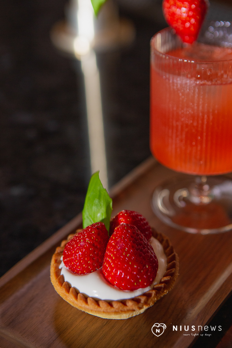 Fizz這一季的酒單主打甜點系氣泡調酒,每杯調酒是以一種人氣甜點做發想,每個月還會主打其中一款的甜點調酒組合,而冬季當然是要吃草莓呀~「草莓羅勒塔Strawberry Basil Tart」以琴酒為基底,搭配上他們自製的草莓羅勒藥草利口酒,草莓糖漿酸甜和清爽羅勒香氣,風味變化豐富,草莓季必喝的一款調酒,搭配上鮮奶油草莓塔更是一絕。