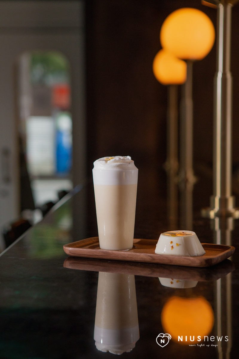 愛吃杏仁的妞妞絕對要點這杯~以調酒師的夢魘「Ramos Gin Fizz」為概念,利用自製杏仁奶的伏特加打造的變化版,一樣有著濃郁的綿密感,和乳酸飲料的清爽,杏仁味不會過重,沒有普通杏仁茶一樣渣渣又化學的味道,即使平常不太吃杏仁的人也能接受!搭配的也是自製的杏仁豆腐,濃郁奶香吃起來有奶酪的口感,配上桂花糖漿更是讓人一口接一口吃不停。
