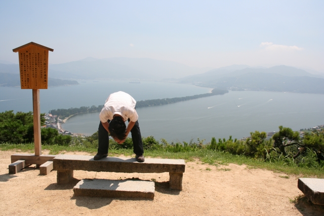 天橋立VIEWLAND是位於文珠山上,可以把天橋立從南側往北側盡收眼底的展望台設施。最佳的觀賞方式,是由下腰姿勢所進行的「股觀」。倒過來觀賞到的天橋立,就宛如往天際飛翔的青龍一般,因此這邊被稱為「飛龍觀」。