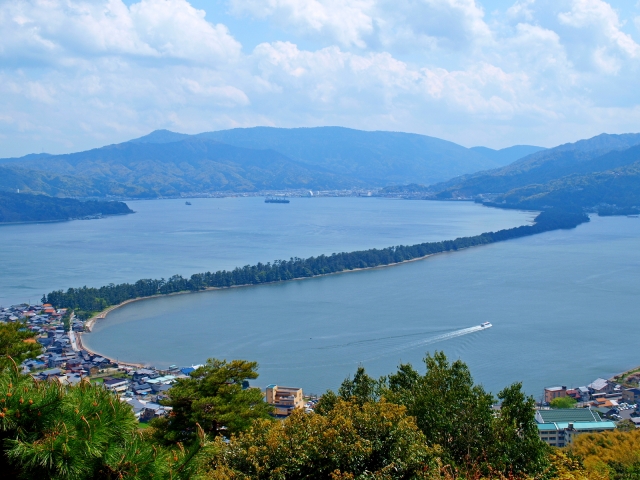位於京都府宮津市,日本海宮津灣上的「天橋立」,是一個全長3.6 公里的沙嘴地形。細長的砂濱,寬度約20~170公尺不等,上面種植了約8000棵的松樹與少部分的廣葉樹,就像是一路延伸到天空的橋樑一般,因此被稱作為「天橋立」。這個經過幾千年的歲月演變所形成的特殊景象,每年吸引了大批的觀光客前來朝聖,不只自古以來被評定為日本三景之一,這邊也是名松百選、日本道路百選、日本歷史公園百選等眾多百選名單的常客。觀賞天橋立的方式,可以從高處眺望整個全景,也可以實際漫步或騎腳踏車在天橋立的砂濱上,感受不一樣的風光。有幾個被稱作為4大觀的天橋立觀賞絕佳地點,介紹如下。