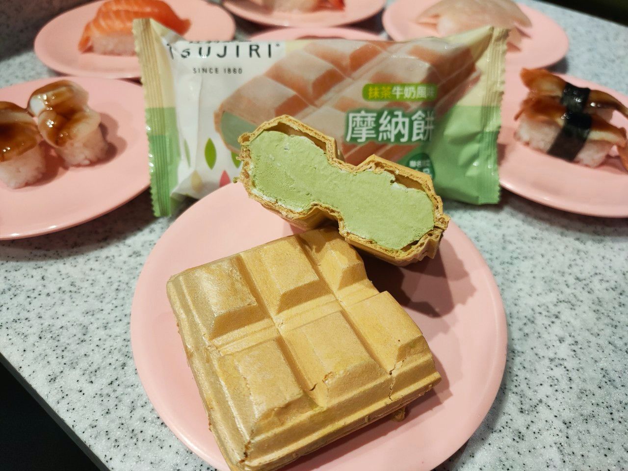 再來是甜點的部分啦~妞編輯最喜歡的就是這款「抹茶牛奶風味摩納餅」,抹茶味香濃、裡面還能吃到白巧克力的清脆口感,讓人吃一口就停不下來,炎炎夏日就是要來一口冰淇淋呀!在爭鮮迴轉壽司、sushiplus、定食8都買得到,各位妞妞們快去買起來~