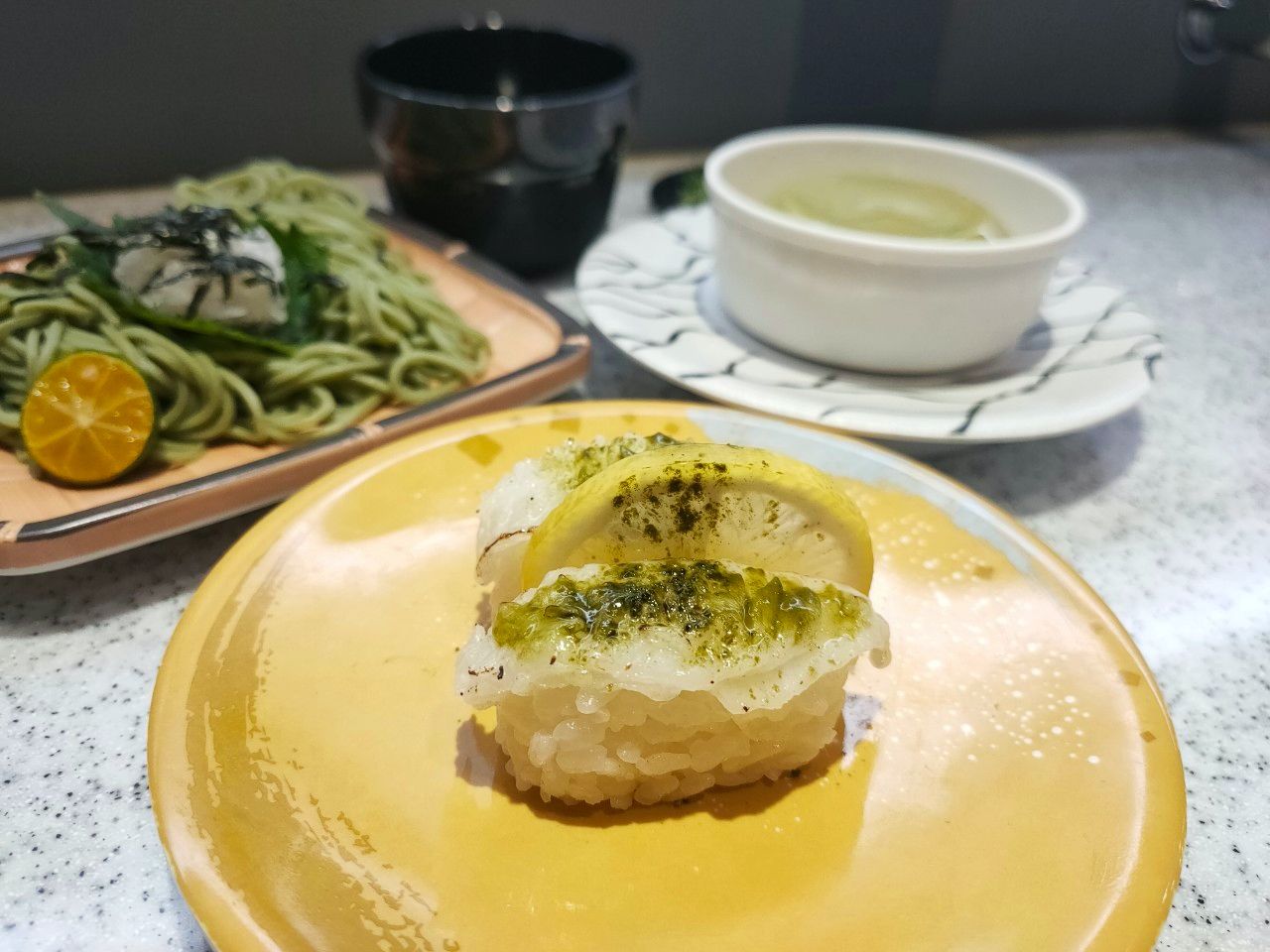 綠色是原諒的顏色(誤)~這滿滿的原諒餐點,就是「爭鮮」與「辻利茶舖」最新合作的抹茶系列料理!首先是來到爭鮮不能錯過的日式握壽司,爭鮮特別打造了「比目魚邊鰭佐抹茶鹽」,將滑順細緻、油脂鮮嫩的比目魚,撒上辻利茶舖特調的抹茶鹽,嚐起來格外清爽,雖然抹茶味沒有很重但是蠻不錯吃的(定食8沒有販售壽司)。