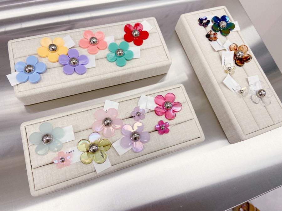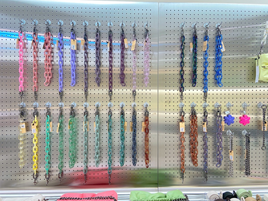 這品牌的包款在包身上都有包鍊扣,所以幾乎每款包除了原本隨附的背鍊之外,都可以拆卸替換不同款式的包鍊,有金屬感的串鍊,也有彩色或透明的壓克力串鍊,也有手提、肩背或斜背等不同長度的鍊帶可以選擇;而我們常看到泫雅的包包上添加了許多可愛的小雛菊配飾,在這邊也有很多可以挑選搭配自己獨一無二的包款。