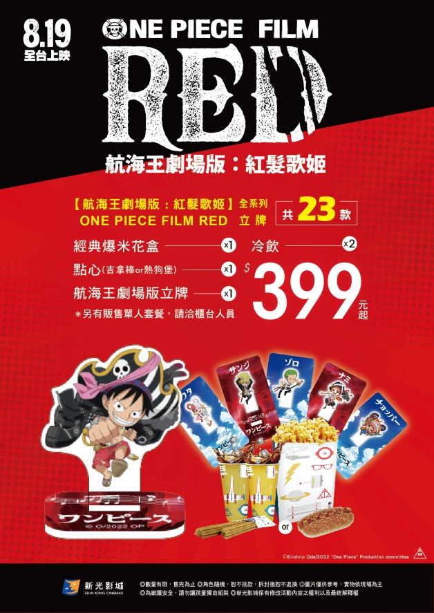 《句商店》全面換上航海王劇場版主題新裝!此次航海王RED劇場版人物造型為主視覺的電影周邊,包含了大家最愛的壓克力立牌(搭套餐)、金屬鑰匙圈($380)、撲克牌($180)以及動漫迷必備的運動毛巾($380),是東映針對此次劇場版所特別發售的商品。此次壓克力立牌搭配電影套餐399元起,總共23款,隨機出貨,新光影城各通路已開始販售,想要一整套就要呼朋引伴一起看航海王劇場版。撲克牌每張圖片角色動作都不一樣,絕對特別!撲克牌、金屬鑰匙圈、運動毛巾都已在《句商店》上架販售,絕對值得各位粉絲收藏。
