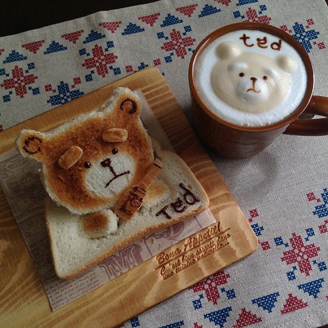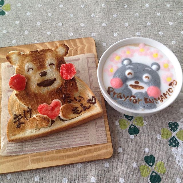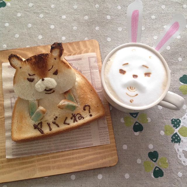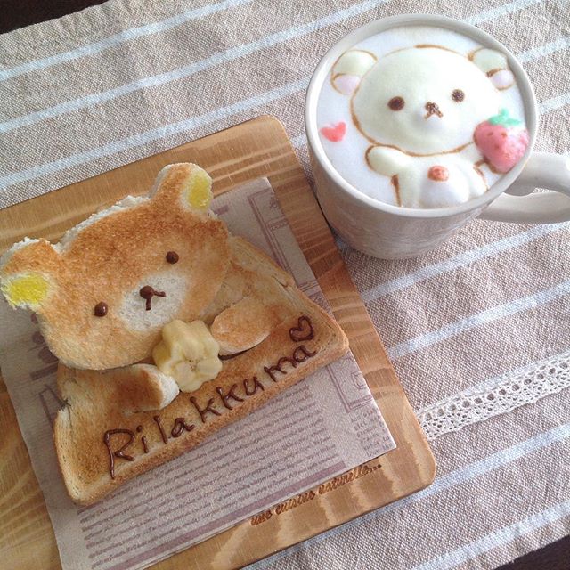 WC熊熊Kumatan不但從吐司上跳出來Say哈囉,還與旁邊的牛奶拉花配成一對!從早餐就給人滿滿的活力啊。