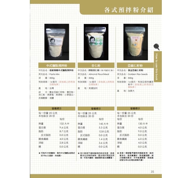 今晚來想點中式?以黃金亞麻仁籽粉、黃豆粉、杏仁粉、燕麥粉、小麥蛋白等製作成的「中式麵點預拌粉」就可以出場取代中筋麵粉,另外還有甜點必備的「馬卡龍杏仁粉」,內含豐富的纖維質和蛋白質,烘焙時可以取代麵粉,「黃金亞麻仁籽粉」則是被醫界證明的超級食物,擁有改善消化、使皮膚變好、降低膽固醇、增加新陳代謝的等好處。