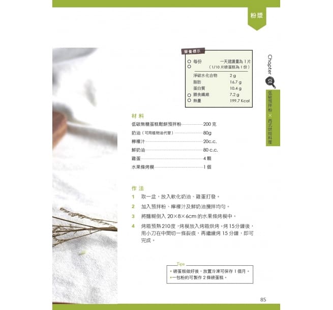 雲朵鮮奶吐司、油封番茄餐包、義式巧可核桃吐司、創意墨西哥捲餅、涮嘴蔥花捲、醬滷牛肉口袋餅、甜蜜花生芝麻酥、鬆軟肉桂捲,從西式麵包、中式麵點到甜點小食都能一步步教你完成!保證沒有花稍手法、做來輕鬆簡單,還特別收錄香蒜奶油醬、油封番茄、酪梨蔬食溫沙拉、香濃生巧克力「低碳減醣輕盈料理小碟」,減肥版烘焙王換你當。