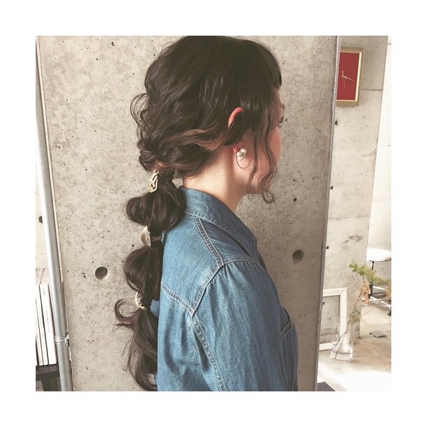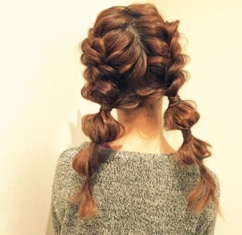 在綁蓮藕頭之前,先用電棒捲稍微將頭髮製造出基本捲度,接著一樣將頭髮綁成單束或雙束的馬尾,並刻意將頭髮拉鬆,製造出隨性自然的浪漫氛圍。