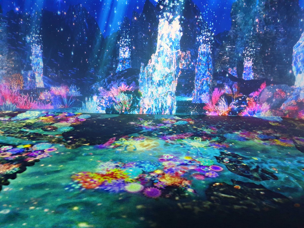 而「PARADISE」堪稱是「光的深海展」的重頭戲,在這塊空間內,可以隨意坐在地上或白沙上,由各種海底生物帶路,進入一段未知的海底龍宮探險旅程,這一路上的景象不禁讓人想起「少年 pi 的奇幻漂流之旅」,自己也像是海底龍宮故事中的主角一般,進入了一場讓人難以忘懷的美夢之中。