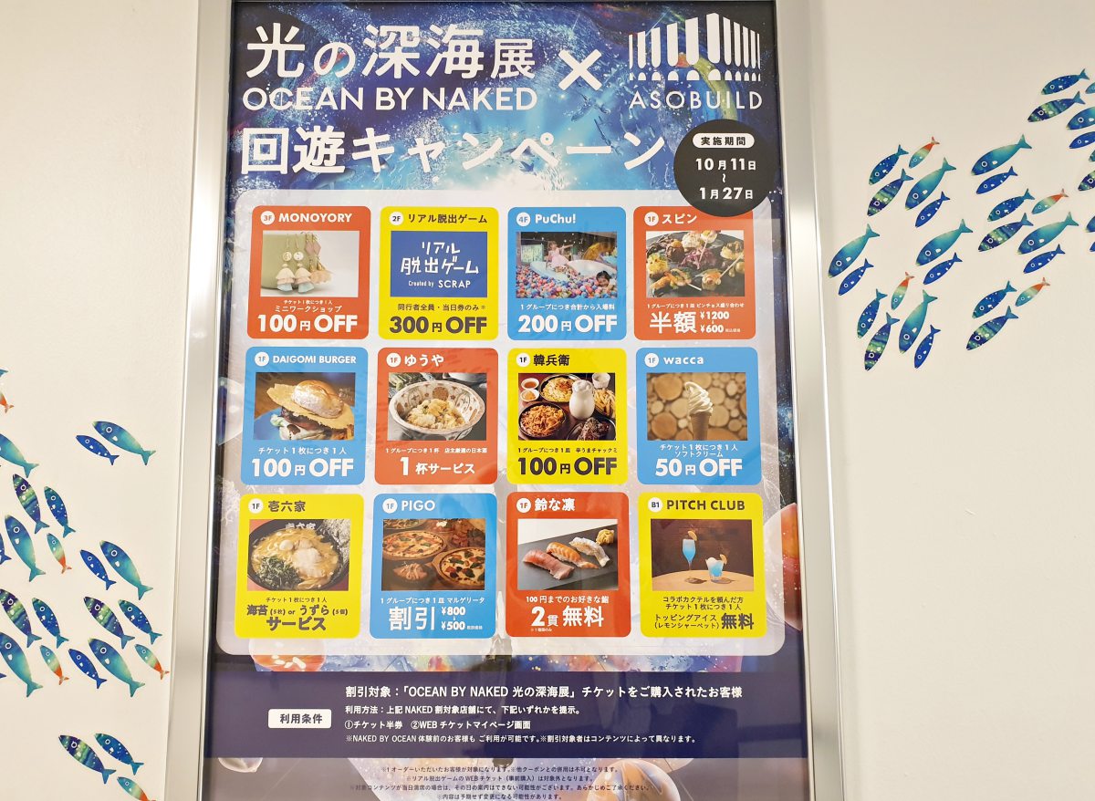 另外,只要是有來「光的深海展」看展的話,憑票根或是網路購票的畫面,也可以在這裡面的店舖或是餐飲店家獲得不同的優惠折扣,看完展之後,要在這邊吃飯或是喝點飲料休息一下也不是問題喔!