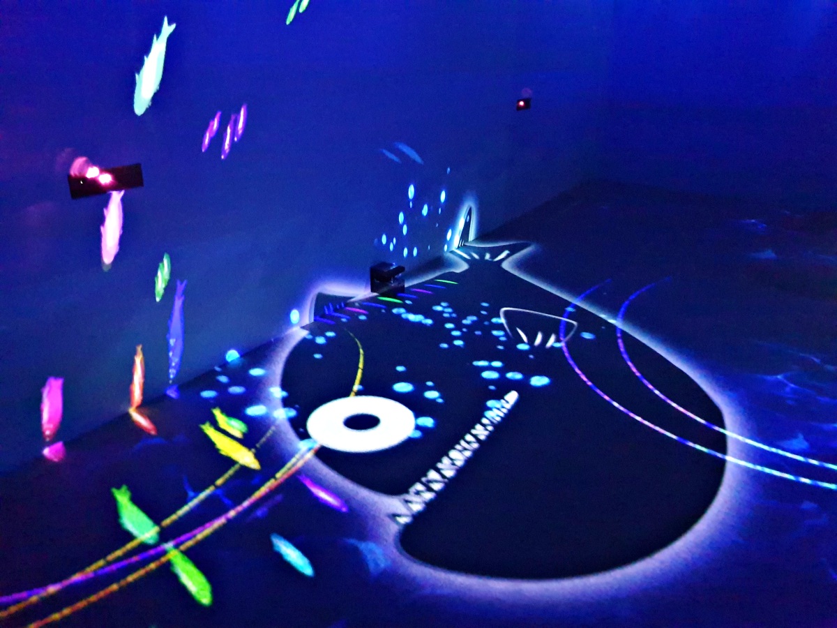 「Fluid Wall」是一個有水母悠遊的海底世界,當你碰觸牆面時,可以讓海流的方向因此改變,形成特殊的七彩水流。