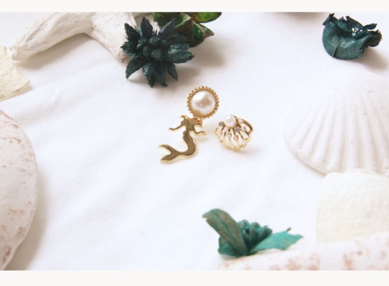 最喜歡不對稱耳環!一邊是小美人魚,另一邊是鑲有亮亮水鑽的貝殼,完全不同造型卻又相互呼應,還有可愛的珍珠襯托,整體氛圍柔和卻又搶眼。