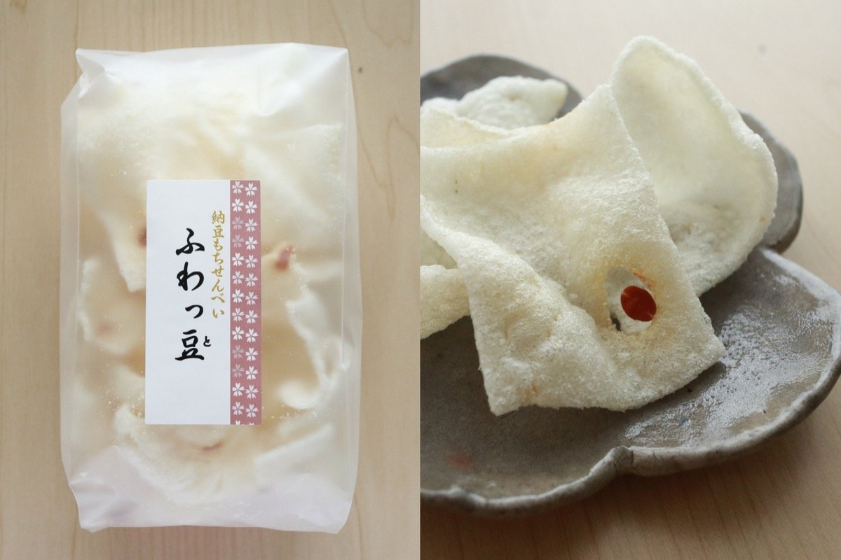 將冬天時自然乾燥的納豆年糕油炸後,就會變身為仙貝。鬆軟又入口即化的特色廣受男女老幼青睞,樸實的滋味讓人忍不住一片接一片。