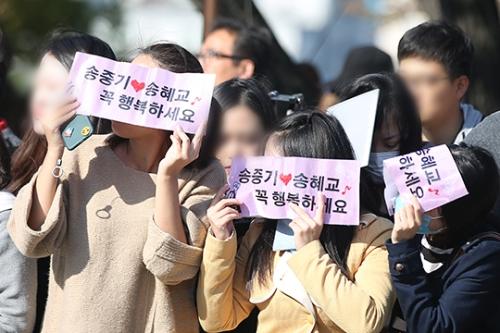 除了許多巨星參加婚禮,也有許多粉絲到場外祝福宋仲基和宋慧喬,據韓媒報導,現場有200餘名的海外粉絲在外守候,受上舉著「宋仲基、宋慧喬,請一定要幸福!