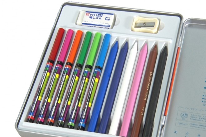 這不管再怎麼看都是蠟筆&色鉛筆的文具組,而且還是日本以製作蠟筆聞名的文具大廠「サクラクレパス」(櫻花文具)的產品。但其實它、根、本、不、是、文、具!蠟筆跟色鉛筆的部份是彩色的眼線筆,至於橡皮擦則可以讓你清理多餘的殘妝,削鉛筆機當然還是用來把筆削尖,只是這次削的是偽裝文具的眼線筆而已~(笑)