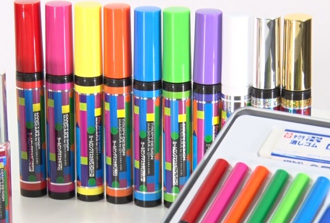 而這一整排總共有10個顏色,看起來像是彩色筆的東西,其實是彩色睫毛膏!而且根據日本網友真實試用後發現,它不只外觀可愛還非常的顯色喔~