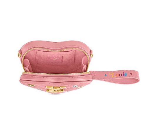 這款愛心包好看也非常實背,除了一條可拆卸的肩背帶、還有一條皮革手提帶及一個背面環圈,讓女生可以肩背、手拿或直接附在皮帶上當腰包,而且手提帶上的彩色Louis Vuitton文字刺繡,更讓這款包看起來活潑可愛!