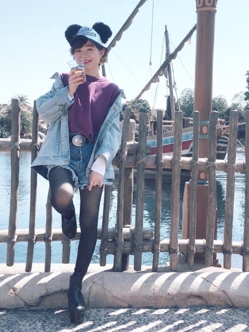 紫色圓領T與丹寧風格真的很搭!而加入存在感十足的大皮帶扣頭以及網襪元素則更有今年感~