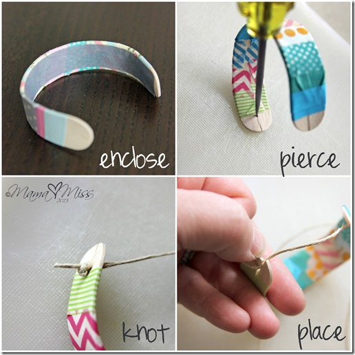 冰棒棍乾了之後,就可以發輝創意,用紙膠帶隨性裝飾妳的手環。最後在棍子尾端打洞,穿過麻繩,調整到適當的長度後將繩子打結,實用的防蚊手環就完成了。